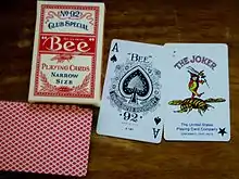 Bee is a casino card brand also sold at retail. Bee playing cards were first manufactured by the New York Consolidated Card Company in 1892, hence the number "92" on the Ace of Spades; the USPC acquired the company two years later, but it continued to operate independently, even after merging with Andrew Dougherty and Standard Playing Card Company to form Consolidated-Dougherty. Standard Bee playing cards have a diamond back, typically blue or red, though casinos frequently use customized Bee cards featuring a logo added to the various colored backs. Until 2010, Bee cards were also sometimes printed in a smooth finish, with a back known as "No. 35", which features worm-like squiggle patterns. Unlike Bicycle cards, Bee cards usually have borderless backs, making the facing of any card that is even partially revealed clearly visible. However, the standard diamond back of the card is very regular and low-profile compared to other back designs, which simplifies "bottom-dealing" and some other forms of sleight-of-hand.