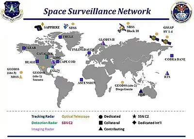 The command accomplishes these tasks through its Space Surveillance Network (SSN) of U.S. Army, Navy and Space Force operated, 30+ ground-based radars and optical telescopes worldwide, plus 6 satellites in orbit.[19]