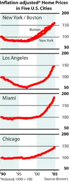Plot of inflation-adjusted home price appreciation in several U.S. cities, 1990–2005. - "Is A Housing Bubble About To Burst?". BusinessWeek. July 19, 2004. Archived from the original on March 4, 2008. Retrieved March 17, 2008.