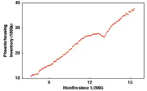 ![]() Comparison of the percentage change in the Case-Shiller Home Price Index for the housing corrections in the periods beginning in 2005 (red) and the 1980s–1990s (blue), comparing monthly CSI values with the peak values immediately prior to the first month of decline all the way through the downturn and the full recovery of home prices. | |