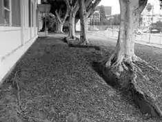 Underground water from the Kuruvungna springs sustains seven mature Indian Laurel Ficus trees on the campus which line a walkway between the classroom building and one of the two teachers' parking lots. In September 2002, LAUSD Area D announced that it would remove the seven ficus trees lining the outside of the classroom building, because the roots had grown into and were pushing up the concrete in the parking lot causing a potential hazard.[43]
