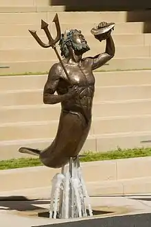 More than a dozen public art projects, part of the Stuart Collection, decorate the campus. Perhaps the most famous of these is the Sun God, a large winged creature by Niki de Saint Phalle located near the Faculty Club. Other collection pieces include Richard Fleischner's La Jolla Project (a collection of Stonehenge-like stone blocks), Do Ho Suh's Fallen Star (a house sitting atop an engineering building in Warren College), a table by Jenny Holzer, an installation by Bruce Nauman on the Powell Structural Systems Laboratory titled Vices and Virtues, and three metallic Eucalyptus trees by Terry Allen.