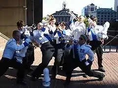 The marching band's musical program is specially arranged for the ensemble, drawn from the classics, jazz, rock and popular idioms. Music and motion are combined through original visual design. The band consists of instrumentalists, including guitar, bass and synthesizer.[1] The band does not have a color guard.