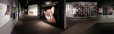 The Hall of Nebraska Wildlife exhibit offers a collection of wildlife dioramas that allow visitors to appreciate animals, birds, and plants from different Nebraskan regions. One component of this exhibit includes an installed modern Bison bison, a presumed descendant of the Nebraskan Ice Age Bison antiquus, an extinct species since 4,000–5,000 years ago.[16] Additionally, in February 2008, the Nebraskan State Museum installed its first mountain lion provided by the Nebraska Game and Parks Commission after it was struck and killed by traffic on Interstate 80. Chemical analysis of the mountain lion's claws suggests it had travelled from the Black Hills of South Dakota along the Missouri or Elkhorn Rivers.[17] The exhibit also displays African animals that fall on the Red List of Threatened Animals, a compiled list of all threatened animals. A few shown animals include the Kobus ellipsiprymnus (Swimming Waterbuck), a medium-sized antelope that is at a "lower risk," and the Diceros bicornis (Black Rhinoceros) who are now "critically endangered" due to overhunting.