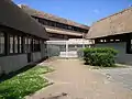 The department is lodged in a three storeys elaborate building with the amphitheatre-like classrooms being grouped at the eastern corner of the complex. The inner infrastructure is made of unpainted crude supporting concrete walls with lighter separation plaster painted walls. The exterior roofing is made of small clay tiles. Brick is also used for the sculptural elements like the well-like artificial space in the center of the inner patio, as well as pebbles for floor decoration. Large glass bays are also used as separation elements.