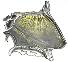 Through the nose, smell is induced when olfactory receptor cells are stimulated by volatile chemicals. The olfactory receptor cells, otherwise known as the primary olfactory neurons, are in the neuroepithelium. The neuroepithelium is located at the top of the nasal vault, which is at the upper portion of the nasal septum. The information received by the olfactory receptors is transmitted by the olfactory nerves to the olfactory bulb through the cribriform plate. In the olfactory bulb, olfactory nerves make synaptic contact with dendrites of mitral and tufted cells. Efferent neurons of the olfactory bulb become the fibers that form the olfactory tracts, which is directly under the frontal lobes in the brain. The axons from the mitral and tufted cells project this information to multiple other regions of the brain including the thalamus, hypothalamus and dorsolateral frontal cortex.[7]