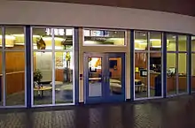Originally located on the fourth floor of the Cathedral of Learning, the 2,500-square-foot (230 m2) $537,000 McCarl Center was opened in 2002[7] and occupies space that once housed two levels of the main stacks of the University's library.[8] Made possible by a gift from F. James and Foster J.J. McCarl, it serves as resource center for non-traditional students and hosts seminars and events.[9] The space was designed by Alan J. Cueri and his architectural firm Strada, LLC, and includes wood finishes, double-height spaces with high ceilings and windows, a main corridor conceived as an interior street, and many elements that refer to the Cathedral of Learning's Gothic architecture including decorative painted metal columns with contemporary buttress-style arches.[10] The center included a resource library, meeting rooms, and a student lounge, and is staffed with academic advisors and has contains a reception area for the College of General Studies.[11] Three unsigned and undated 7 feet (2.1 m) by 3 feet (0.91 m) glass-encased murals that depict Renaissance painting styles and which have long belonged to the University but are of unknown origin hang in a hallway outside the Center.[12]