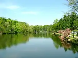 The University of Richmond's campus consists of 350 acres (1.4 km2) in a suburban setting on the western edge of the city. Most of the campus lies within the city limits; a small section of the south campus, including the Special Programs Building (home to the student health center and the campus police), intramural sports fields, and most of the campus apartments, lies within Henrico County.[55] The institution has, with few exceptions, remained true to the original architectural plans for the campus—red brick buildings in a collegiate gothic style set around shared open lawns. Many of the original buildings, including Jeter Hall and North Court, both residence halls, and Ryland Hall, the original administration building and library for Richmond College, were designed by Ralph Adams Cram in 1910. Cram, a noted institutional architect, also designed buildings for Princeton, Cornell, Rice, and Williams, among other universities. Warren H. Manning, a former apprentice to Frederick Law Olmsted, designed the original landscape plan. The overall effect of the gothic architecture set amid a landscape of pines, rolling hills, and Westhampton Lake, is intimate and tranquil. In 2000 and again in 2021, the campus was recognized by The Princeton Review as the most beautiful in the United States.[56]
