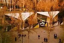 The University of Tehran main entrance was designed in 1965 by Korosh Farzami, one of the students of the faculty of Fine Arts of the University and built by Arme Construction Company and ARCHEN consulting Company where Farzami was a founder and CEO there as well.[1] There is a documentary film which name is "Vafaye Engare" directed and made by Hesam Bani-Eghbal and Khashayar Hazrati Vand with the supporting of ARCHEN consulting Company, that mentioned the details about this architectural entrance and analyzing its design process.[2][3]