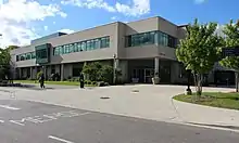 In response to the doubling of student enrolment over the past decade, the UTM campus building infrastructure has continued to expand to meet growing enrollment needs.[32][33] The construction of the Instructional Centre, also known as the Instructional Building (IB), had plans drawn out in 2002.[34] Located next to the Hazel McCallion Academic Learning Centre and Library on the north side at the end of the campus's outer circle road, the Instructional Building covers a total of 13,000 square metres (140,000 sq ft) of space spread out throughout its three stories. The much-innovated construction of the IB building is composed of green patinated copper strips aiming in a vertical direction continuing inside the building, adding to the physical appearance of the facility.[35] The use of the copper panels increases classroom space by 50% and increases the use of green infrastructure by 60%.[35][36] UTM's Instructional building includes geothermal heating and cooling systems under the nearby football field as well as awnings with thin photovoltaic cells which contribute to shade on the south side of the building.[35][36][37] Other renewable energy ideas were also included in the construction of the building such as the inclusion of green roofs and reflective membranes which play a big role in the reduction of urban heat as well as energy and water-efficient lighting and fixtures.[36][37] The building has been considered as a LEED silver-certified project and will soon be certified as LEED Gold. In addition, the building contains many windows, which enable much light to enter which creates a warm and friendly atmosphere for students.[32]