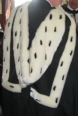 Bachelor of Arts. A black stuff gown of Cambridge BA pattern. A black silk hood, part-lined and bound with 'miniver' – white fur with black spots. (Rabbit was usually used, with 'stick-on' spots, on account of the cost of real miniver!). As with the BD, it could be made in either the Oxford or the Cambridge shape, but Cambridge became the norm.