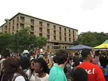 East Campus as seen from the north of the campus. Solomon Mahlangu House and the high-rise buildings of Braamfontein are visible in the background.