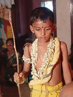 Upanayana (Sanskrit: उपनयन upanayana), also known as janai or janea, poita/paita, Yagnopavita, Bratabandha,Bratopanayan is one of the traditional saṃskāras (rites of passage) that marked the acceptance of a student by a guru (teacher or tutor) and an individual's initiation into a school in Hinduism. The tradition is widely discussed in ancient Sanskrit texts of Hinduism and varies regionally.[2] The sacred thread (yagnyopavita, janeu, or poonal) is received by the boy during this ceremony, which he continues wearing from the left shoulder to the right crossing the chest thereafter. Generally, this ceremony should be performed before the advent of adulthood.