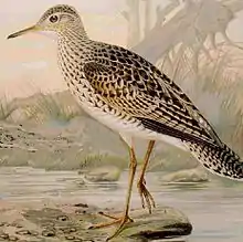 The upland sandpiper (Bartramia longicauda) is a large sandpiper, closely related to the curlews.[2] Older names are the upland plover and Bartram's sandpiper. In Louisiana, it is also colloquially known as the papabotte.[3] It is the only member of the genus Bartramia. The genus name and the old common name Bartram's sandpiper commemorate the American naturalist William Bartram. The species name longicauda is from Latin longus, "long" and caudus, "tail".[4] The name "Bartram's sandpiper" was made popular by Alexander Wilson, who was taught ornithology and natural history illustration by Bartram.