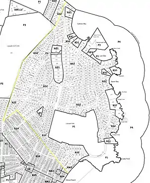 The bedrock under Uplands is quartz diorite gneiss.[7][8] Soils are well drained sandy loams of the Cadboro and Langford series (Cd-L or Lsl), or poorly drained sandy clay loams of the Tolmie series (Tscl); all have thick dark topsoils. In near-shore areas the soils are more stony and are mapped as Langford-Rough Stony complex(L-Rs).[9]