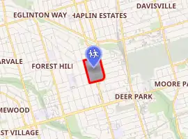 Upper Canada College occupies an open, 17 hectare (43 acre)[13][64] campus in Deer Park, near the major intersection of Avenue Road and St. Clair Avenue, in the residential neighbourhood of Forest Hill. There are 15 buildings on the site:[65]