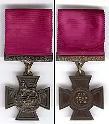 Besides its own archives containing records that outline the history of Upper Canada, the province of Ontario, and the city of Toronto dating back to the mid-19th century,[87] the college also has a notable collection of artwork, antiques, and war medals. This includes the Order of Canada insignia presented to Robertson Davies, Foster Hewitt, Charles Band, and Arnold Smith,[88] plus Canada's first Victoria Cross, awarded in 1854 to Old Boy Alexander Roberts Dunn, and the Victoria Cross given, and ceremonial sword belonging,[39] to Hampden Zane Churchill Cockburn;[88] the valour medals were given to the Canadian War Museum on permanent loan on 17 May 2006.[89] In the college's chapel, itself decorated with works by Canadian artists, is an altar made of marble from parts of St. Paul's Cathedral, in London, England, that were damaged in the Blitz and donated by Dean of St. Paul's Walter Robert Matthews. On this is an altar cloth made from a piece of that which was used for the coronation of Queen Elizabeth II.[68] Held is an American flag that flew atop one of the World Trade Center towers in New York City. Further, the school holds works by Thoreau MacDonald and a collection of original paintings from the Group of Seven (though several were auctioned by the college in an effort to pay for the lawsuits it faced in 2004);[90][91] an original Stephen Leacock essay, titled Why Boys Leave Home—A Talk on Camping, donated in 2005 and published for the first time in The Globe and Mail;[92] and the original manuscript of Robertson Davies' work The Mask of Aesop, which he wrote in 1952 specifically for the Prep's 50th anniversary.[88] Also in UCC's possession is a chair owned by Sir John A. Macdonald and another that once belonged to George Airey Kirkpatrick.[93]