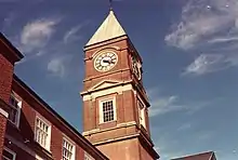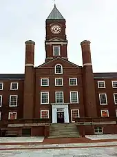 The main structure (the Upper School), constructed between 1959 and 1960, central on the campus, and with a dominant clock tower, houses the secondary school component of the college, in a quadrangle form. Laidlaw Hall, the principal assembly hall, featuring a full theatre stage and a pipe organ, is attached to the west end of the Upper School and, at the other end, is the Memorial Wing, the school's main infirmary.[66] Closing the north end of the main quadrangle (which is the location of the statue of the Lord Seaton, installed in 1934[67]) is one building, built in 1932, that contains the two boarding houses, as well as two private residences for the associated boarding masters,[47] adjacent to which is the school chapel, donated by Governor General Vincent Massey.[68]