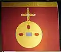 The colour was presented to the regiment in Enköping by the Supreme Commander, general Johan Hederstedt on 20 May 2000. The colour replaced an older which was presented to the former Royal Uppland Regiment (I 8) in 1955 and which was handed over to S 1 in 1957.[3] The colour is drawn by Kristina Holmgård-Åkerberg and embroidered by hand in insertion technique by Sofie Thorburn. Blazon: "On red cloth the provincial badge of Uppland; a yellow orb, banded and ensigned with a cross-crosslet. On a yellow border at the upper side of the colour, battle honours (Varberg 1565, Narva 1581, Lützen 1632, Warszawa 1656, Frederiksodde 1657, March Across the Belts 1658, Rügen 1678, Düna 1701, Kliszow 1702, Holovczyn 1708, Helsingborg 1710, Svensksund 1790) in red."[3]