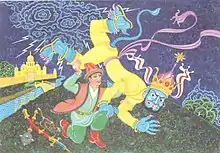 Based on the Turkic and Iranic folk song traditions, the poem narrates about the heroic deeds of Ural-batyr. Ural is born to an elderly couple, Yanbike and Yanbirðe.[3][lower-alpha 1] Ural evinces from his very infancy all the features of a legendary hero, such as unflinching courage, honesty, kindheartedness, empathy, and great physical strength. Unlike his cunning and treacherous brother Shulgan (see Sulgan-tash), Ural is an eager enemy of the evil and of Death which personifies it. Having matured, Ural sets out on the quest for Death, with the desire to find and destroy Him. On his way, he meets with various people and legendary creatures and is often deferred by long adventures; in all cases, his actions serve to save lives or quell the evil. Riding his winged stallion Akbuthat (or Akbuz At 'White-Grey Horse'),[4] he saves young men and women prepared for sacrifice by the tyrannical Shah Katil from imminent death, tames a wild bull, destroys an immense number of devs, marries the legendary Humai (from Persian همای Humay), a swan-maid, and finally smites the chief dev (from Persian دیو div) Azraka, whose dead body is said to have formed Mount Yaman-tau in the South Urals. Ural-batyr perishes in his final grapple with the devs, as he is forced to drink up a whole lake where they had hidden from him, but he leaves his sons to continue his initiative.