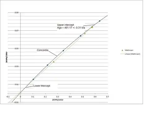 These are said to yield concordant ages(t from each equation 1 and 2). It is these concordant ages, plotted over a series of time intervals, that result in the concordant line.[6]