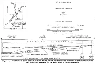 A Navajo discovered uranium in 1942 in Monument Valley on the Navajo Nation in northeast Arizona. The first mine in the district opened in 1948. Uranium and uranium-vanadium minerals occur in fluvial channels of the Shinarump Sandstone member of the Triassic Chinle Formation. Ore deposits are associated with carbonized wood in the sandstone.[2] Mining stopped in the Monument Valley district in 1969, after producing 8.7 million pounds (3900 metric tons) of uranium oxide, more than has been produced from any other uranium mining district in Arizona.[3] In 2005 the Navajo Nation declared a moratorium on uranium mining on the reservation, for environmental and health reasons.