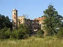 The main church, the Church of Archangel Michael, was mentioned in 1218. The present church was built in 1750–1789 in the Baroque style. It was restored in the 19th century, but burned down in 1945. It was subsequently rebuilt in 1951-1953 by the priest Franciszek Dorżyński. In 1970 a new interior with polychrome was added. In 1997, the church was flooded to a height of 40 cm. In the years 1997–2000 it was renovated. In the church there are sculptures brought by repatriates from Navaria, near Lviv.[2] There is the ruins of a castle, Zamek Uraz, (Uraz Castle), dated to 1319, which was destroyed by the 1950s.[3]