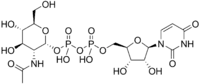 Uridine diphosphate N-acetylglucosamine or UDP-GlcNAc is a nucleotide sugar and a coenzyme in metabolism. It is used by glycosyltransferases to transfer N-acetylglucosamine residues to substrates. D-Glucosamine is made naturally in the form of glucosamine-6-phosphate, and is the biochemical precursor of all nitrogen-containing sugars.[1] To be specific, glucosamine-6-phosphate is synthesized from fructose 6-phosphate and glutamine[2] as the first step of the hexosamine biosynthesis pathway.[3] The end-product of this pathway is UDP-GlcNAc, which is then used for making glycosaminoglycans, proteoglycans, and glycolipids.[4]