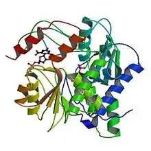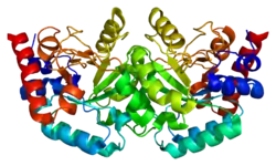 UMPS exists in various forms, depending on external conditions. In vitro, monomeric UMPS, with a sedimentation coefficient S20,w of 3.6 will become a dimer, S20,w = 5.1 after addition of anions such as phosphate. In the presence of OMP, the product of the OPRTase, the dimer changes to a faster-sedimenting form S20,w 5.6.[9][10] These separate conformational forms display different enzymatic activities, with the UMP synthase monomer displaying low decarboxylase activity, and only the 5.6 S dimer exhibiting full decarboxylase activity.[11]