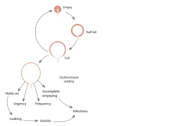 A baby's bladder fills to a set point, then automatically contracts and empties. As the child gets older, the nervous system develops. The child's brain begins to get messages from the filling bladder and begins to send messages to the bladder to keep it from automatically emptying until the child decides it is the time and place to void.