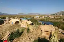 As of 2011, about 1,200 Uru lived on an archipelago of 60 artificial islands,[7] clustering in the western corner of the lake near the port town of Puno.[8] The islands have become one of Peru's tourist attractions, allowing the Uru to supplement their hunting and fishing by conveying visitors to the islands by motorboat and selling handicrafts.[7][8]