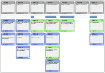 Story maps can easily provide a two-dimensional graphical visualization of the Product Backlog: At the top of the map are the headings under which stories are grouped, usually referred to as 'epics' (big coarse-grained user stories), 'themes' (collections of related user stories[33]) or 'activities'. These are identified by orienting at the user’s workflow or "the order you'd explain the behavior of the system". Vertically, below the epics, the actual story cards are allocated and ordered by priority. The first horizontal row is a "walking skeleton"[34] and below that represents increasing sophistication.[35]