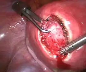 ![]() A laparoscopic myomectomy: The uterus has been incised and the myoma is held and about to be shelled out | |