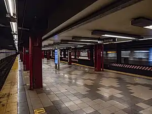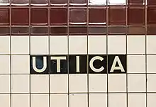 The station has four tracks and two island platforms, typical for a four-track express station.[7] The outer track walls are made of tile and have a maroon trim line with a dark maroon border. Small black tile captions reading "UTICA" in white lettering on a black background run below the trim line at regular intervals. The station's I-beam columns are painted maroon, alternating ones having the standard black station name plate with white lettering. Renovations added looping maroon tile patterns at the mezzanine level, as well as the platform's floor pattern. Renovations also added new old-fashioned light fixtures with modern sodium-vapor lamps in them, which are suspended on long rods from the high, vaulted ceilings.
