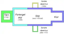 Following the Protestant Reformation, the church nave was expanded westward in 1686, with the masonry in the original eastern parts preserved. Afterwards, the total length of the church measured 64 metres (210 ft). From 1739 to 1742, the church underwent a large renovation project. During this time, a new tower with a flat roof was built on the west end. In 1779, the roof of the tower was changed to have a pyramid-shaped roof with a new spire on top. Throughout the 1700s, the church transitioned into having baroque decor.[6][7][5]