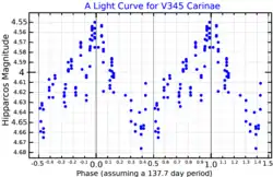 V345 Carinae is a star in the constellation Carina. It has the Bayer designation E Carinae; V345 Carinae is the variable star designation. The star has a blue-white hue and is faintly visible to the naked eye with an apparent visual magnitude that fluctuates around +4.66.[3] Its actual brightness varies from magnitude +4.67 to +4.78 with a period of 137.7 days.[4] Based on parallax measurements, it is located at a distance of approximately 1,010 light years from the Sun.[2] It is drifting further away with a radial velocity of around +19 km/s.[3]