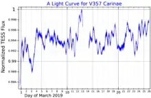 V357 Carinae is a probable variable star; its brightness varies from magnitude +3.41 to +3.44 with a period of 6.74 days, which is its orbital period. It was classified as an eclipsing binary in Gaposchkin's original catalogue of variable stars,[10] although the variability was often considered doubtful.[3] It is now thought most likely to be a very shallow eclipsing binary.[2]