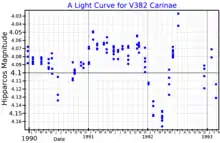 The radial velocity of V382 Carinae has long been known to be variable, but variations in its brightness were unclear. Brightness variations were detected by some observers, but others found it to be constant.[10] It was formally named as a variable star in 1981, listed in the General Catalogue of Variable Stars as a possible δ Cephei variable.[11][3] It has been described as a pseudo-Cepheid, a supergiant with pulsations similar to a Cepheid but less regular.[8]