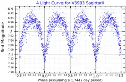 V3903 Sagittarii varies in brightness. The General Catalogue of Variable Stars lists it as a possible hot irregular Orion variable star, but it has been shown to be a detached eclipsing binary system. The two stars are detached, that is they do not fill their roche lobes, which makes it an Algol-type eclipsing variable. The period is one day, 18 hours, 52 minutes.[11][6]
