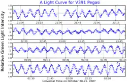 In 2007, research using the variable star timing method indicated the presence of a gas giant planet orbiting V391 Pegasi.[7] This planet was designated V391 Pegasi b. This planet around an "extreme horizontal branch" star provided clues about what could happen to the planets in the Solar System when the Sun turns into a red giant within the next 5 billion years.[8]