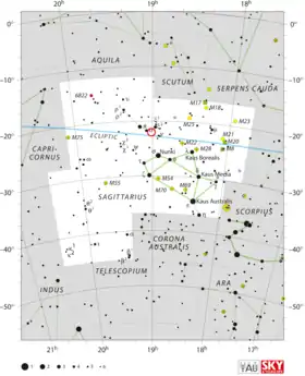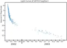 V4743 Sagittarii was a bright nova in the southern constellation of Sagittarius. This event was discovered by K. Haseda and colleagues in September 2002.[1] It peaked at magnitude 5.0[7] on September 20, 2002, then declined rapidly thereafter. It reached a peak temperature of 740,000 K around April 2003 and remained at that level for at least five months, suggesting the white dwarf component has a mass of 1.1–1.2 M☉.[8] The distance to this system is uncertain.[3] Infrared observations indicate a distance of approximately 21 kly (6.3 kpc).[4] A derivation using maximum magnitude rate of decay showed a distance of 12.7 ± 1.0 kly (3.9 ± 0.3 kpc).[8]