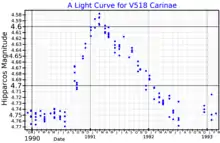 518 Carinae was discovered to change in brightness after analysis of Hipparcos photometry. The amplitude of the variations seen is 0.2 magnitudes, with possible periods of 100 and 971 days.[11] It is classified as a γ Cassiopeiae variable.[12][4]