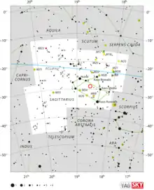 V5668 Sagittarii, also known as Nova Sagittarii 2015 Number 2 was the second and brighter of two novae in the southern constellation of Sagittarius in 2015 (the first was V5667 Sagittarii, reported on 12 February 2015[6]). It was discovered by John Seach of Chatsworth Island, New South Wales, Australia on 15 March 2015 with a DSLR patrol camera. At the time of discovery it was a 6th magnitude star.[7][8] It peaked at magnitude of 4.32 on March 21, 2015, making it easily visible to the naked eye.