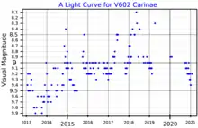 V602 Car is a semiregular variable star with a maximum brightness range of magnitude 7.6 - 9.1[12] and a period of 635[12] or 672[3] days. Despite the large amplitude of variation, it was only named as a variable star in 2006.[3][12]
