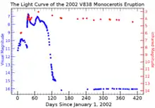 On January 6, 2002, an unknown star was seen to brighten in the constellation Monoceros, the Unicorn.[1] Being a new variable star, it was designated V838 Monocerotis, the 838th variable star of Monoceros. The initial light curve resembled that of a nova, an eruption that occurs when enough hydrogen gas has accumulated on the surface of a white dwarf from its close binary companion. Therefore, it was also designated Nova Monocerotis 2002. V838 Monocerotis reached maximum visual magnitude of 6.75 on February 6, 2002, after which it started to dim rapidly, as expected. However, in early March the star started to brighten again, especially in infrared wavelengths. Yet another brightening in infrared occurred in early April. In 2003 the star had returned to near its original brightness before the eruption (magnitude 15.6) but now as a red supergiant rather than a blue main-sequence star. The light curve produced by the eruption is unlike anything previously seen.[2] In 2009 the star was about 15,000 L☉,[11] which in the absence of extinction would correspond to an apparent magnitude of 8.5[lower-alpha 1]