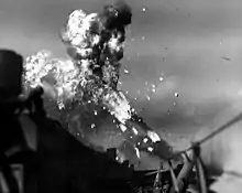 On the morning of 25 October, Fighting 18 pilots once again escorted bombers on sector searches to locate Admiral Jisaburō Ozawa's carrier force. Searches for the main force were negative, though VF-18 pilot Frederick Wolff located and bombed a separate group of destroyers. Full strikes from Intrepid and other carriers arrived around 0830 over Ozawa's forces. VF-18 pilots recorded 1 near miss (Donald Watts) and 2 probable hits (Charles Amerman, Richard Cevoli) on a light carrier as well as 1 hit (Frederick Tracy) on the IJN's last remaining carrier veteran of Pearl Harbor, Zuikaku. Though a second strike was ready, the urgent messages reaching Admiral Halsey from Task Force 77 caused him to break off his battleships with Intrepid again as the battle-line carrier. This force sped south to try to catch Admiral Kurita as he once more retreated through San Bernardino Strait.[33]