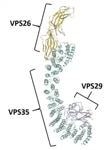 VPS35 binds with other proteins to form the retromer, an evolutionarily conserved complex that plays a major role in transmembrane protein recycling from endosomes to the trans-Golgi network (TGN).[1][6][7][8][9] VPS35 itself folds into a secondary structure that represents an α-helical solenoid, containing 34 α-helix repeats.[17]