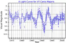 VY Canis Majoris is a variable star that varies from an apparent visual magnitude of 9.6 at minimum brightness to a magnitude of 6.5 at maximum with an estimated pulsational period of 956 days.[2][8] In the General Catalogue of Variable Stars (GCVS) it is classed a semiregular variable of sub-type SRc, indicating a cool supergiant,[2] although it is classed as a type LC slow irregular variable star in the American Association of Variable Star Observers (AAVSO) Variable Star Index.[8] Other periods of 1,600[42] and 2,200[22] days have been derived.