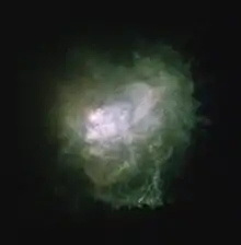 Combining data from the mentioned telescope with others from the Keck in Hawaii it was possible to make a three-dimensional reconstruction of the envelope of the star. This reconstruction showed that the star's mass loss is much more complex than expected for any red supergiant or hypergiant. It became clear that the bows and nodules appeared at different times; the jets are randomly oriented, which prompts suspicion they derive from explosions of active parts of the photosphere. The spectroscopy proves the jets move away from the star at different speeds, confirming multiple events and directions as with coronal mass ejections.[33] Multiple asymmetric mass loss events and the ejection of the outermost material are deduced to have occurred within the last 500 to 1,000 years, while that of a knot near the star would be less than 100 years. The mass loss is due to strong convection in the tenuous outer layers of the star, associated with magnetic fields. Ejections are analogous to—but much larger than—coronal ejections of the Sun.[9][33][34]