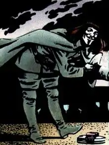 V is the title character of the comic book series V for Vendetta, created by Alan Moore and David Lloyd. He is a mysterious anarchist, vigilante, and freedom fighter who is easily recognizable by his Guy Fawkes mask, long hair and dark clothing. He strives to topple a totalitarian regime of a dystopian United Kingdom through acts of heroism. According to Moore, he was designed to be morally ambiguous, so that readers could decide for themselves whether he was a hero fighting for a cause or simply insane.[1]